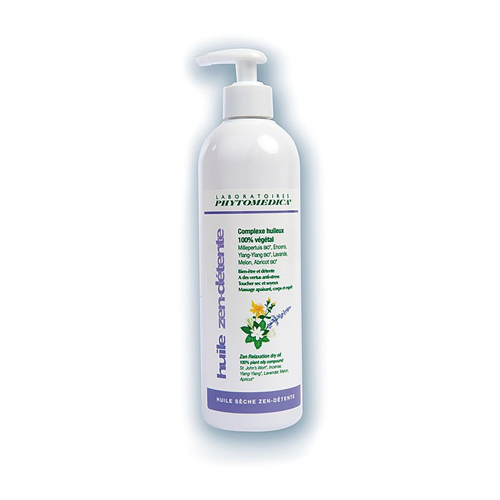 Huile sèche zen-détente à base de à base de noyaux d'Abricot Bio, de Lavande, de Melon équitable, d’Ylang-ylang Bio, de Millepertuis Bio et d’Encens pour un massage relaxant.