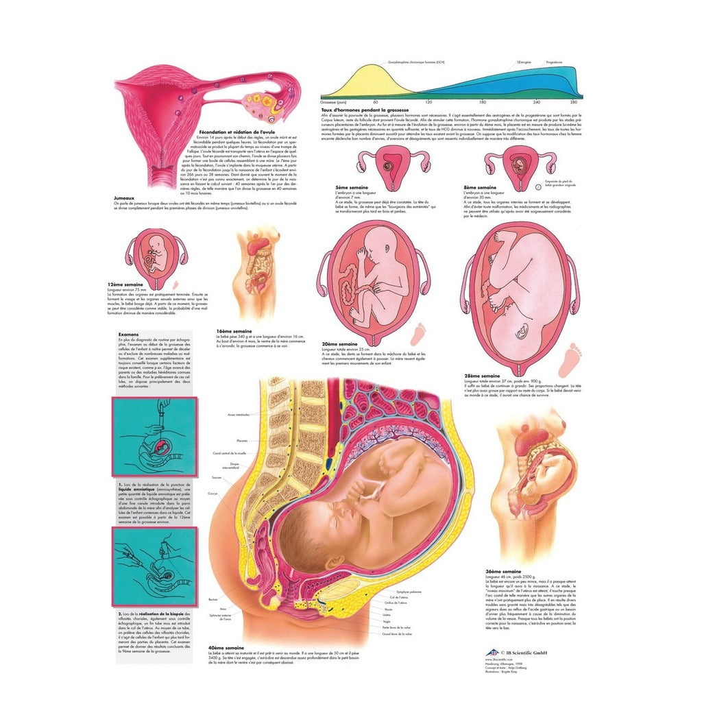 Cet outil pédagogique illustre les différentes étapes de la grossesse. Cette planche anatomique permet aux médecins, gynécologues, obstétriciens, spécialistes d’expliquer de façon explicite aux futures mamans, les cycles de la gestation. Depuis la fécondation et la formation du fœtus et de l’embryon jusqu’au neuvième mois de naissance du bébé. Cette affiche met en avant les différentes phases du développement du fœtus, ses mensurations, les différentes positions qu’il peut adopter, les formations de chaque organe au cours de la grossesse.