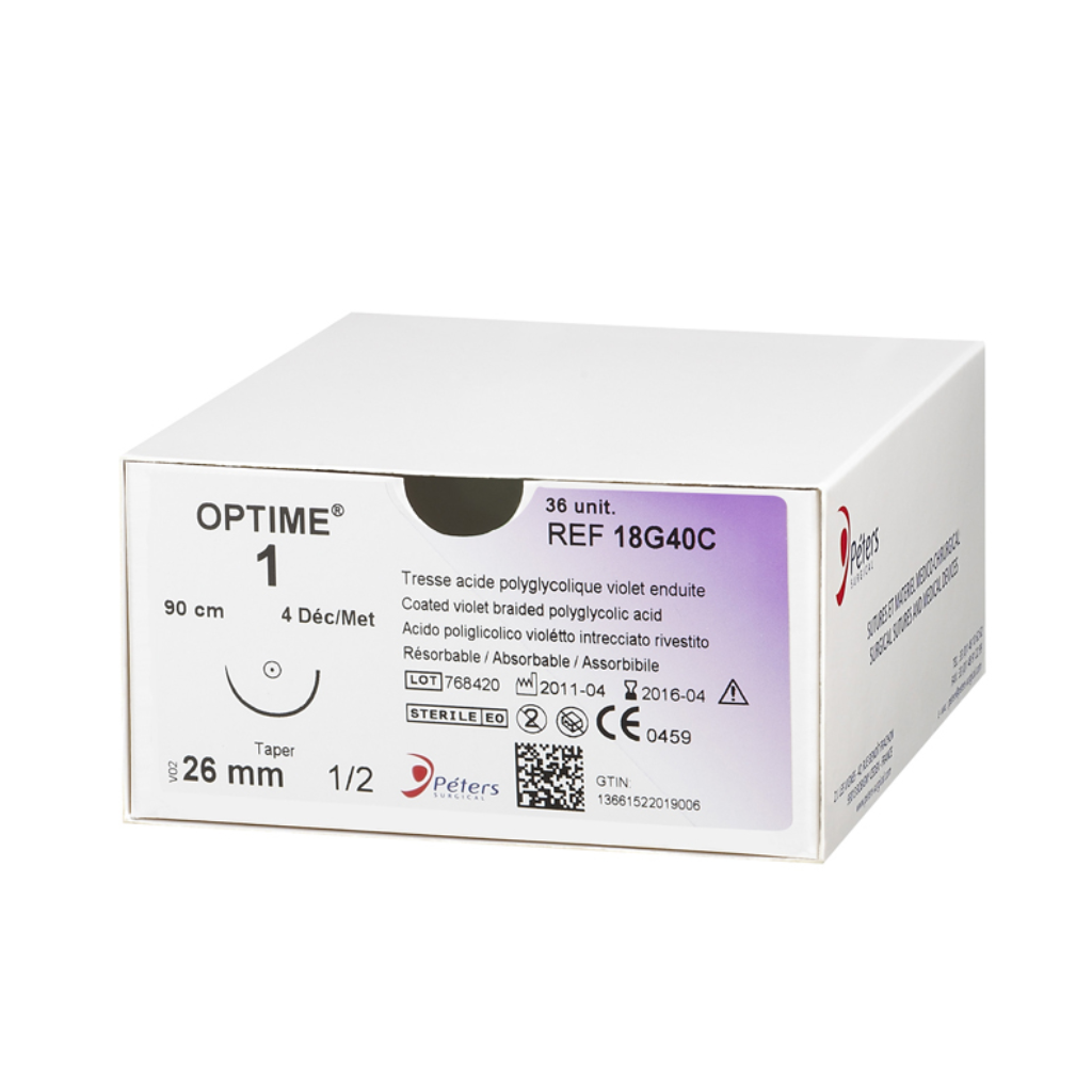 Les fils de suture Optime de chez Peters sont des fils résorbables qui se présentent sous la forme d’une tresse d’acide polyglycolique (PGA), à la structure fine et serrée avec une excellente résistance à la traction, enduite de polycaprolactone et de stéarate de calcium. Les fils de suture Optime sont utilisés pour la suture de tissus à temps de cicatrisation moyen nécessitant un fil résorbable, avec le bénéfice d’une résorption rapide. Stérile et à usage unique, les fils de suture Optime R sont donc idéals pour la suture de tissus à temps de cicatrisation moyen nécessitant un fil résorbable en chirurgie générale, digestive, gylécologique ou orthopédique.