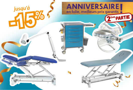 Divans d'examen, table de massage, lampes d'examen... en promotion Anniversaire !