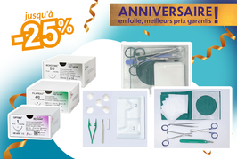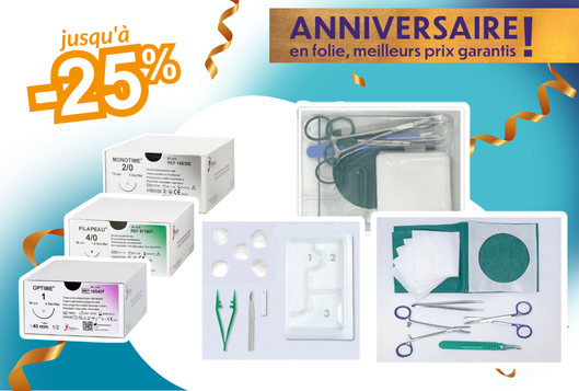 Sets d'intervention, sets de suture, sets d'ablation de suture, sutures résorbables et non résorbables.. en promotion Anniversaire !