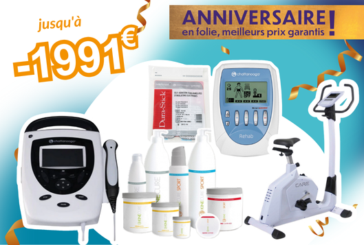 Electrostimulateur, Electrodes, Crèmes, gels, huiles,appareil à ultrasons, vélos… en promotion Anniversaire !